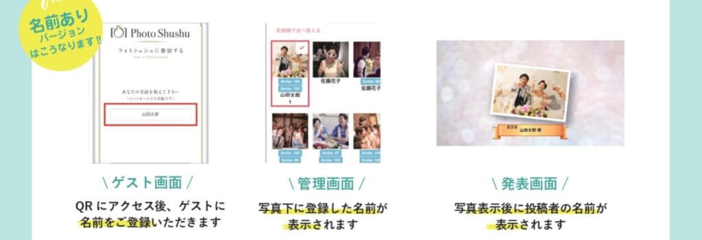 フォトシュシュの新バージョン「名前ありバージョン」を使って、ぜひ新郎新婦様もゲストも楽しい結婚式を作ってくださいね!